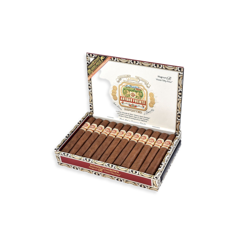 Arturo Fuente Magnum R Rosado Sungrown is a special cigar collection series years in the making intended to stand apart from the rest of the Fuente family of cigars. One look at the decorative gold band and luxe box and you already know what to expect. Rosado refers to its rich reddish color from the mature wrappers. Ecuador Sungrown Sumatra, these rare rosie wrappers are aged for nearly a decade, giving these cigars a sweet distinct finish and elegant undertones of leather, cream, cedar, pepper and roasted pinenuts. Not too heavy, not too light, but just right.